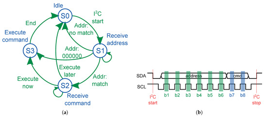 The DataProc is written as a state machine. Transitions between the states depend on the received data. (a) The state machine in DataProc. (b) Schematic representation of the I2C based communication protocol.