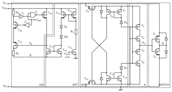 The switch is turned off by pulsing . This causes to pull current from the gate, deactivating the switch. As long as and are active, S cannot freely move, which is why needs to be pulsed. If after deactivating the switch , S stays at 0 V and Circuit A will function immediately. When , S needs to follow . Diodes make sure that S (and ) can become negative enough to activate Circuit A.