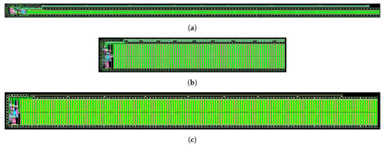 SOMBRA is designed in the I3T50 technology provided by OnSemiconductor. This smart-power IC technology is a 50 V extension of a standard 0.35 m CMOS process. As explained in the previous section, a different version of SOMBRA was designed. SOMBRA-LV10 implements a LV switch for a maximum of 10 A load current. The on-resistance of the N-channel metal-oxide-semiconductor field-effect transistor (NMOS) is the I3T50 technology, which is quite area-effective. SOMBRA-LV10 was designed for an on-resistance of 1.6 m at 27 C (2 m at 85 C). It uses an NMOS with a total channel width of 842,850 m (0.8 m), in total occupying about 9 mm. An image of the layout is shown in Figure 8a. For the HV version, we created SOMBRA-HV05, capable of blocking voltages up to 50 V, but with a maximum load current of 5 A. Because of the lower area efficiency of the HV NDMOS switch, the on-resistance was limited to 7.6 m at 27 C (9.5 m at 85 C). To achieve this, the NDMOS channel width needs to be 1,600,000 m (1.6 m), resulting in a total chip area of 13 mm (See Figure 8b). As a final exercise, we also created SOMBRA-HV10, an HV switch for a 10 A load current. To keep the power dissipation below 0.5 W, the on-resistance was designed for 3.8 m at 27 C (4.8 m at 85 C). The NDMOS channel length would have to be 3,200,000 m (3.2 m) with a total die area of 25 mm (See Figure 8c). It is clear that this last chip is huge, would be very expensive and not economically viable. This version of SOMBRA was not manufactured. Figure 8 shows that the area needed for all other parts of the design (DataRec, DataProc, etc. Located at the very left side of the layout) is negligible compared to the area occupied by the switch itself.
