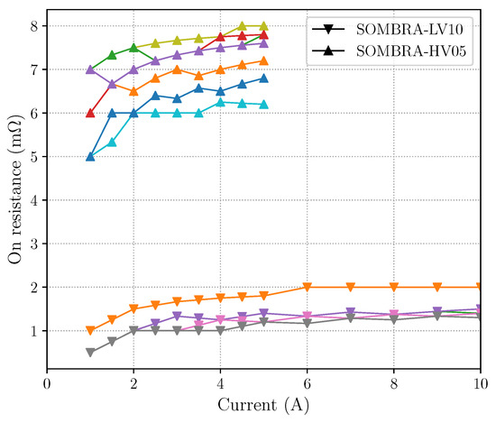 As we are able to successfully turn on (and off) the switches, the on-resistance can be measured. The results are collected in Figure 11. For both SOMBRA-LV10 and SOMBRA-HV05, 10 switches were measured. They both perform somewhat better than designed. For the HV version, we measured an average on-resistance of 7.3 m at the maximum load current of 5 A. The LV version measured an average resistance of 1.3 m at 10 A.