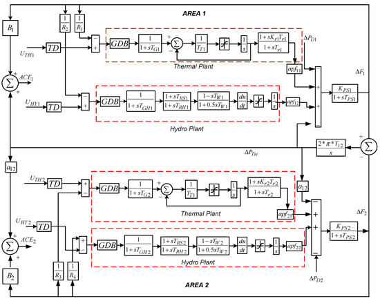 In recent years, the consumption of power increased gradually regardless of power generation. This sudden increase in load creates some imbalances in power system operation such as the frequency and tie-line power deviations. This problem can be avoided by connecting a fast-acting automatic generation control for controlling the power generation between various control areas by holding the frequency as constant [1,2,3,4]. Automatic generation control plays a vital role in large-scale interconnected electrical power units to maintain the frequency and tie-line power as close as possible to the pre-defined values. The speed governing system in the AGC helps to manage the frequency and tie-line power within pre-defined values by varying the mechanical power input to the generators. A healthy power system must supervise the load changes and system disturbances to ensure an acceptable quality of power through the preservation of voltage and frequency within acceptable boundaries [5,6,7,8].