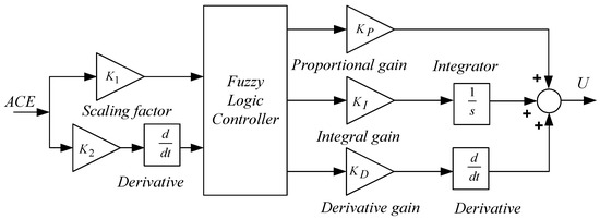Linear controllers such as integral (I), proportional-integral (PI), proportional-derivative (PD), and proportional-integral-derivative PID controllers were used to get the required transient and steady-state performance in various power electronics and power system applications to attain specified control objectives. However, linear controllers are not suitable for systems having higher order, with time delay and non-linearities. Fuzzy logic controllers (FLC) are non-linear controllers, which work well in closed-loop control systems; however, these controllers require fine-tuning in their design and implementation. Many researchers established that FLCs improve the closed-loop performance of classical controllers by updating the controller parameters online to handle the changes in the operating point [33,34,35,36,37]. However, the main limitation of the FLC is the lack of a systematic design process, and improper tuning of parameters may lead to the divergence of system stability. The tuning of FLC with rule-based membership functions (MFs) is complicated and, hence, may not be efficient. Gain tuning must be implemented, as it is the most familiar way of tuning the FLC to enhance the performance [33]. Therefore, rule-based standard MFs can be used for various applications, and scaling factors can be tuned for optimum fuzzy PID control [33]. Taking all these considerations into account, the fuzzy PID controller was chosen here to solve the AGC problem, as shown in Figure 2. The fuzzy controller uses the error and derivative of error as input signals. In the present study, the input signal was the area control error of the power system. Here, K1 and K2 were the input scaling factors of the FLC. The FLC output was multiplied with KP, KI, and KD and then summed to give the total controller output. The outputs of the fuzzy controllers and were the control inputs of the power system.