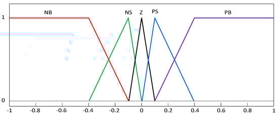 The fuzziness of the FLC is characterized by MFs having different shapes such as triangular, bell, trapezoidal, sigmoid, gaussian, and piecewise linear. Out of these, bell, triangular, and trapezoidal MFs are preferred for real-time applications as they can be represented easily, need nominal memory storage, and can be manipulated efficiently through a fuzzy interface engine. From the literature, triangular MFs were extensively implemented in controller design, as the parametric practical depiction of these MFs is economical when compared to other MFs. Therefore, triangular MFs were considered in the present study. Moreover, an identical representation of MFs is preferred for having better computational effectiveness and superior memory usage [36]. Thus, similar MFs were selected for error, error derivative, and FLC output. The structure of the MFs (Mamdani type) is shown in Figure 3, which was considered for both the inputs and outputs.