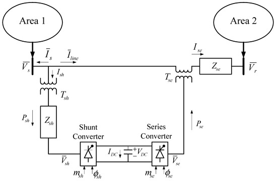 Single line diagram of two-area power system with unified power flow controller (UPFC).