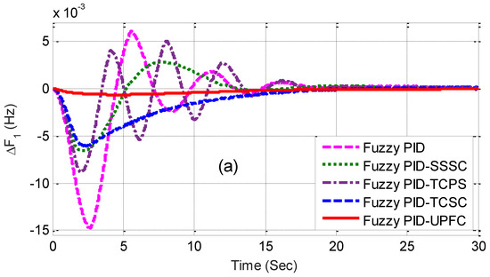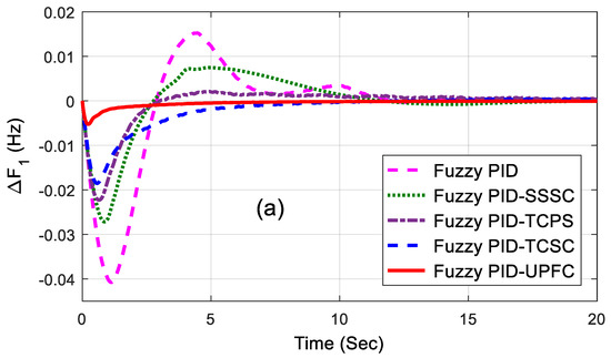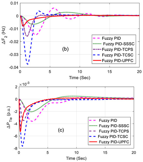 The related dynamic performances of the system are shown in Figure 6a–c, where it can be noted that the system with the UPFC provided the best performance compared to others. The dynamic performance of the system was assessed for 1% SLP in area2 without retuning the control parameters, and the equivalent responses are shown in Figure 7a–c. The superiority of the system incorporated with a fuzzy PID and UPFC was also shown by evaluating the eigen values of the proposed system, as tabulated in Table 4. From the concept of relative stability, it is known that the system is better damped if it has more negative eigen values or if the poles of the congested loop scheme are further away from the imaginary axis. From Table 4, it can be noted that the eigen values of the UPFC structure were more adverse than the others and, therefore, it provided better damping.