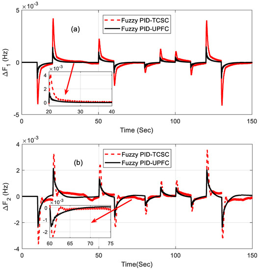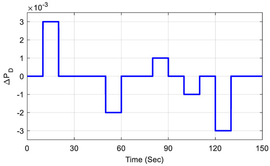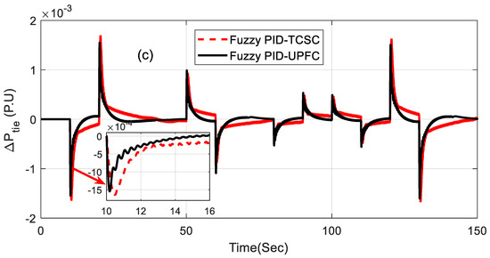 Furthermore, the effectiveness of the proposed controller was also analyzed by introducing a random step load as shown in Figure 10, and it was tested for the fuzzy PID controller with TCSC- and UPFC-incorporated systems, which showed superior performance. The step load disturbance was varied randomly from 0 s to 150 s, and the responses of the system were observed. In general, the frequency decreased when the load increased and viceversa. The best scenario considered the random load from 10 s to 20 s, as it increased when the system’s frequency decreased accordingly. The related responses in Figure 11a–c show how the system responded to a random step load. From these responses, it can be commented that the proposed controller can withstand any sudden changes in load disturbance.
