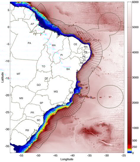 Northern states of AP, PA and MA stand out with their broad and shallow continental shelves (Figure 10a). This region corresponds to nearly 155,924 km or 48.9% of the country’s shelf between 0 and 35 m depth (318,618 km). Vitória-Trindade chain peaks on the shelf area distribution off BA and ES coasts (13.3 % in area). The broad shelf of RS state has 21,034 km or 6.6% of the area between 0 and 35 m. If extending the depth range to 100 m, the main areas are on the north (AP to MA, 258,954 km) and southeast and south (RJ to RS, 178,741 km). These regions correspond respectively to 44% and 30% of the country’s area for this depth range (589.465 km ).