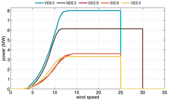 Empirically derived power curves are provided by turbine manufacturers and are shown in Figure 2. Turbines start to produce power with speeds around 3.0 m·s, referred to as the “cut-in” speed. After that, the power generation grows proportionally to the cube of wind magnitude, until the turbine reaches its maximum capacity. Beyond the “rated speed” the turbine generates constant output until the “cut-out” speed is reached. That refers to the wind magnitude at which the turbine shuts down for self-protection (Table 1).