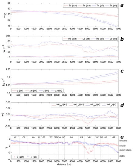 Along-coast variability of thermodynamic fields. Here the x-axis represents the distance (km) along the Brazilian coast, from its northern limit at Amapá (AP, left) to its southern end at Rio Grande do Sul (RS, right). (a) air () and sea surface () temperatures. (b) sensible () and latent () heat fluxes. (c) surface () and hub-height () air densities. (d) surface virtual temperature fluxes due to sensible () and latent heats (). (e) dimensionless stability function . Colors refer to January (red) and July (blue). All quantities were averaged along the sectors shown in Figure 1 up to depths of 100 m. Coastal states’ labels are shown in the bottom panel.