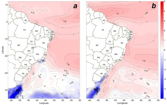 Surface atmospheric () and sea surface temperatures () for January and July are shown in Figure 3a. The northern and northeastern shelves are under direct influence of the warm and salty tropical waters of the North Brazil and Brazil currents [,]. Seasonal variability is small and and are around 27 ± 1C in this region. Towards the poles, and decrease, also presenting substantial seasonal variability. Southern temperatures are around 24 C in January and 15 C in July.