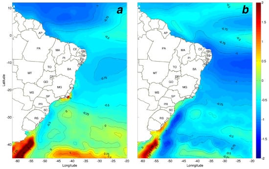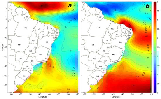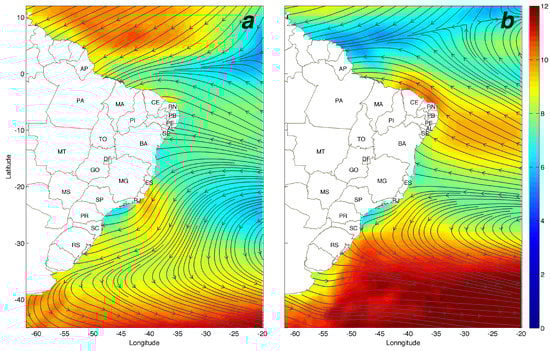 The SAA is located near 30 S and 20 W in January, when northeasterly to easterly mean winds dominate the southeastern and southern Brazilian coasts. Northeast winds are especially strong over RJ (9 m·s), SC and RS (8.5 m·s). In July the SAA migrates northward to 28 S and the Westerlies become more dominant for RS coast. Brazil’s southern region experiences synoptic changes of wind conditions. Cold fronts hit the area frequently throughout the year, but with more force in the fall-winter [,]. Average July wind speeds are around 10 m·s on SC, RS, and RN, and CE coasts.
