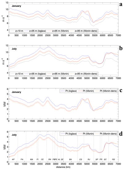 Along-coast variability of wind speed and turbine power. The x-axis represents the distance (km) along the Brazilian coast, from its northern limit at Amapá (AP, left) to its southern end at Rio Grande do Sul (RS, right). Panels (a,b) are wind magnitudes at z = 10 m and at the hub height (z = 95 m), computed with three different methods for January and July, respectively. Panels (c,d) are power distributions estimated from SE 6.2 power curve and three methods for January and July, respectively. Labels refer to the logarithmic extrapolation method (log-law, ), the Monin–Obukhov (Monin, ) and Monin–Obukhov with density correction (Monin-dens, ). All quantities were averaged along the sectors shown in Figure 1 up to depths of 100 m. States names are listed in the legend of Figure 1.