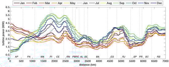 Turbine power distribution along the Brazilian coast, from Amapá (AP) in the north to Rio Grande do Sul (RS) on the southern border. Colored lines represent the monthly climatological (1987–2014) power for a Senvion 6.2 turbine. The Monin–Obukhov extrapolation method and the density correction of Equation (10) are considered.