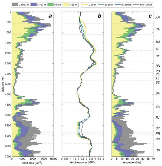 (a) Shelf area, (b) turbine mean power and (c) resource distribution R. Here the y-axis represents the distance (km) along the Brazilian coast, from its northern limit at Amapá (AP, top) to its southern end at Rio Grande do Sul (RS, bottom). Shelf area (km) is computed from ETOPO1 data using the section divisions of Figure 1. Filled curves correspond to depths intervals that vary from 0–35 m (yellow) to 0–1000 m (gray). Turbine average power is computed for the depth intervals: 0–35 m, 35–50, 50–100 and 100–1000 m. Wind resource (GW) is estimated from for the same depth intervals used in the area computation (panel a). Estimates are based on the SE 6.2 power curve, considering Monin–Obukhov vertical extrapolation and the density correction of Equation (10). Coastal states’ divisions are depicted by horizontal dashed lines and their labels are placed on the right.
