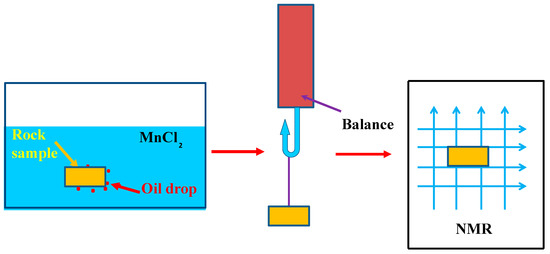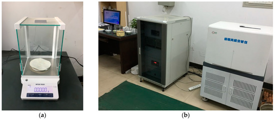 The experimental device for sample mass determination was a Mettler Toledo balance (ME204E, Mettler Toledo, Shanghai, China) with an accuracy of 0.0001 g, as shown in Figure 1a. The volume of the imbibition water and the expelled oil was estimated by sample mass change and the density difference between oil and water. The NMR device (MinNMR, Niumag Analytical Instrument Corporation, Suzhou, China) is shown in Figure 1b. NMR is a non-destructive test method, and the T2 spectra can well reflect the pore structure and fluid distribution characteristics. The higher the T2 value, the larger the pore size of the fluid concentration. The T2 spectra amplitude is positively related to fluid volume in the certain aperture pores. By measuring the changes of T2 spectra amplitude during the imbibition process, it is possible to understand the oil and water migration characteristics due to capillary pressure imbibition.