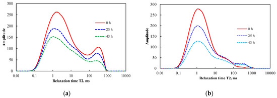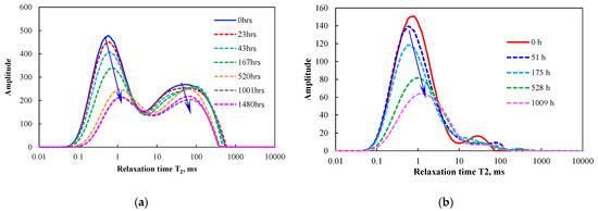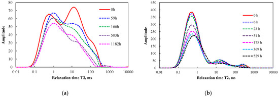 The T2 spectra vs soaking time in WEH-1 and WEH-2 samples: (a) WEH-1 and (b) WEH-2.