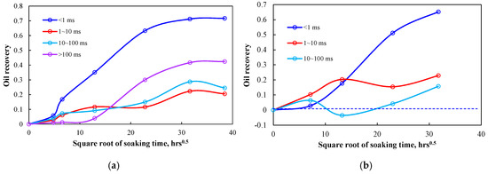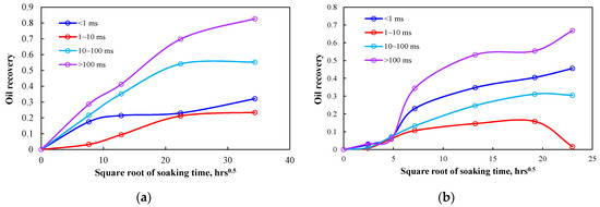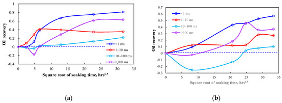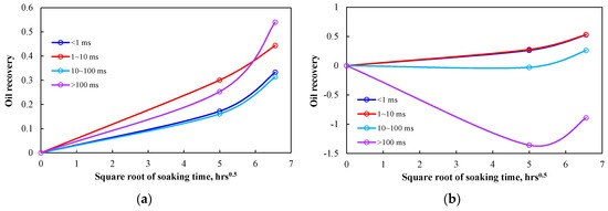 According to the T2 relaxation time of Meng et al. (2016) [19], the tight rock pores were divided into micro-pores (<1 ms), small pores (1–10 ms), largish pores (10–100 ms) and large pores (>100 ms). The largish pores and large pores included micro-fractures and matrix pores. Figure 5 presents oil recovery in different diameter pores. The oil recovery of the micro-pores was larger than 70%, that of small pores and largish pores was much lower than 30% and that of largish pores was about 40%. Unexpectedly, the smaller pores did not have a much larger imbibition oil recovery.