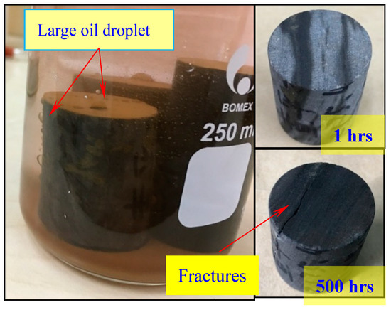The Figure 11 shows the observations of QT-1 before and after experiments. It can be seen that a large amount of oil droplets was precipitated, and the volume of the oil droplets significantly exceeded that of the sample UC7-1. Figure 12 presents the NMR images at different soaking times. Evidently, there was no fractures in the sample at the beginning of the experiment. When the soaking time exceeded 43 h, a large number of micro-fractures were generated on the surface of sample. The micro-fractures were not natural fractures and they were induced during the experiments. It should be noted that nuclear magnetic signals can only be detected when oil is contained in the micro-fractures. This suggests that a large amount of oil migrates into the micro-fractures during the process of micro-fracture propagation. The new fractures were in the direction of the formation bedding planes, which may result from the opening of bedding planes. The QT reservoir had a clay mineral content of about 23.7%, which formed a strong expansion stress to induce the fracture propagation after encountering water [11].
