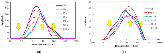 The T2 spectra vs soaking time in UC7-2 and LC7-2 samples: (a) UC7-2 and (b) LC7-2.