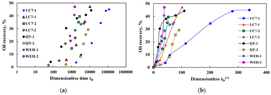 The oil recovery vs dimensionless time tD and tD0.5: (a) oil recovery vs tD and (b) oil recovery vs tD0.5.
