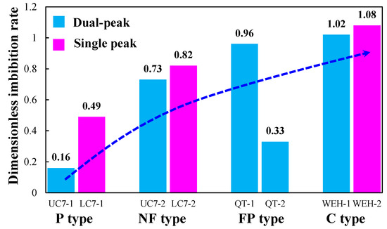The dimensionless imbibition rate of different reservoirs samples is presented in Figure 19. The pore (P) type rock represents the tight reservoirs that only developed matrix pores for the oil migration channel. The natural fracture (NF) type corresponds to the tight reservoirs that developed both matrix pores and micro-fractures. The fracture propagation (FP) type means that the clay expansion could induce fracture propagation during water imbibition. The effects of in situ stress on fracture propagation were not taken into account. The clay (C) type refers to the tight reservoirs that are characterized by a high content of clay minerals (>40%). These different types of tight reservoirs were comparatively studied (Figure 19).