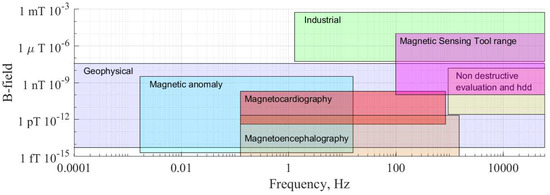 The evaluation of cement integrity is of primary importance to the oil and gas industry [9]. Poor cementation can lead to costly accidents and serious damage to the environment. According to a BP report [10], one of the reasons for the Macondo well blowout on 20 April 2010, was poor zonal isolation with a foam cement. Thus, cement placement and the evaluation of cement quality must both be improved. Magnetic particles are used in different applications. They enable various tasks to be performed remotely. In medicine, these particles are used for drug delivery systems, cancer diagnosis, or bioseparation [11]. In the oil industry, they are used for hydraulic fracture evaluation, EOR, and other applications [12]. The magnetorheological approach can be used to inject cement slurry uniformly into an annular space between the casing and borehole wall. Magnetic cement slurry can be displaced into regions where it would not otherwise flow when pumped conventionally [13]. Magnetic properties of cement change with time because of heating and aging. Electrical properties of a cement-based magnetorheological fluid differ from those of common cement. The presence of conductive particles increases the magnetic permeability of the cement [14] and, because of the proximity of the cement-filled annulus to casing, one can use the magnetic susceptibility logging method to determine cement quality. It is necessary to estimate the magnitude of the useful signal and quantify appropriate measurement methods. This leads to an accuracy assessment of the sensors or magnetometers that should be installed in the magnetic cement sensing tool. A thorough analysis of the available sensors and frequency ranges helped us compile Figure 1. Measurement of electromagnetic fields for geophysical purposes covers a wider range than those required by most of the other fields. For example, when performing cross-well EM exploration, the noise level was estimated as nT [15]. The magnitudes of magnetic fields used in cardiac or brain medical research are also very small and require precise and expensive equipment. We do not need such a high accuracy for assessing the quality of magnetic cement as flux-gate magnetometers, Hall-effect sensors, or solenoid type sensors are quite sufficient.