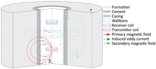 To simulate magnetic susceptibility logging, we solved the Maxwell equations of electromagnetism [30] in cylindrical coordinates. Transmitter coil generates a primary magnetic field that produces an eddy current in the formation, see Figure 2. The primary and secondary magnetic fields induce an electromotive force in the receiver coil. Only the vertical component, , of the magnetic field is considered. Key model assumptions are: