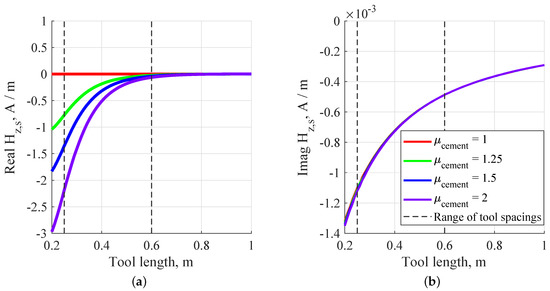 Effect of magnetic permeability of cement on magnetic field at the frequency of 1 kHz: (a) Tool length vs. real part of secondary field, . (b) Tool length vs. imaginary part of .