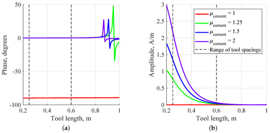 Figure 4 shows that the signal amplitude is suitable for extracting magnetic properties of cement. Simulation results presented in Figure 3 and Equation (7) support this conclusion. The signal amplitude is insensitive to cement resistivity, i.e., to cement rheology in the frequency range from 0.1 to 10 kHz. Signal simulations for different configurations of borehole geometry show that the singularities of the signal phase are caused by the magnetized cement and its distance from the measurement point.