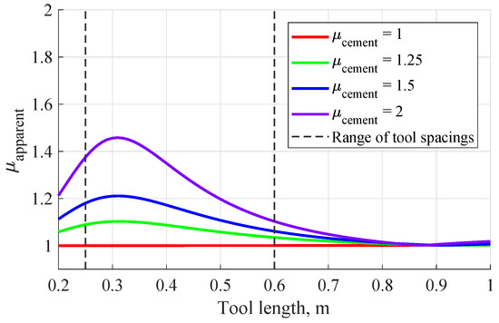 Apparent magnetic permeability in Figure 5 differs from the actual permeability of magnetic cement because only a part of the medium is magnetic. In Figure 4b, the apparent magnetic permeability has been calculated from the signal amplitude. Finally, short tools are more sensitive to the magnetic properties of cement.