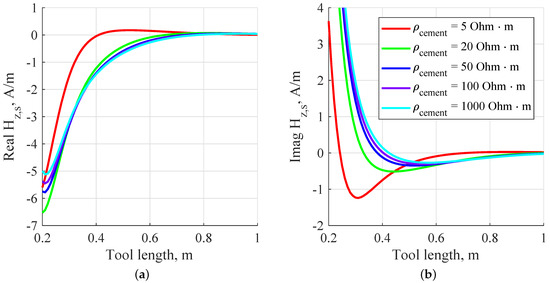 Intensity of (a) real and (b) imaginary part of vs. tool length at the frequency of 200 MHz. Different state of the cement is considered: The harder the cement, the higher the resistivity.