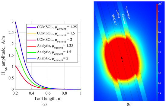 COMSOL software calculations and analytic solutions were identical, see Figure 7a. We considered a point magnetic dipole, oscillating at the frequency of 1 kHz. The dipole was located at the origin, the length of the well was 3 m, the diameter of the model was 3 m, and the geometric and electrical parameters of the model are from Table 1. The nonuniform mesh parameters used in the modeling are: the maximum element size cm and the minimum one m. Maxwell’s equations are solved in the frequency domain, and the number of degrees of freedom is 1,199,956. The external boundary is assumed to be a magnetic and electric insulator. Due to the short length of the probes relative to the model size, the influence of the external boundary can be neglected. Simulations were carried out in two environments to obtain the secondary magnetic field, i.e., air and the medium under study. The response in the air was subtracted, i.e., the tool response was calibrated. The signals were calculated using Equation (7). The signals computed with the finite element method were less smooth than those from the analytical calculations. Despite the very fine mesh, the COMSOL-computed signals were rough, see Figure 7a. Increasing the element sizes further reduced the accuracy of the calculation. The magnetic field strength scale was amplified in Figure 7b to improve visualization of the field distribution. Relative to a non-magnetic medium, a magnetic cement with = 2 is practically a “magnetic conductor”.