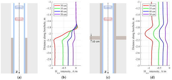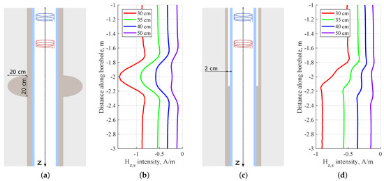Figure 8a,b show that an incomplete rise of cement could be determined by an abrupt decrease of amplitude of the secondary magnetic field. Figure 8c,d and Figure 9a,b demonstrate that the proposed tool was capable of detecting cement inhomogeneities and it was more sensitive to the near wellbore region. The shape and intensity of magnetic logging curvesweare determined by the shapes of heterogeneities filled with cement. Cement adjacent to the well casing generated the strongest tool response. An absence of cement resulted in a sharp decrease of magnitude of the secondary magnetic field observed in Figure 9c,d.