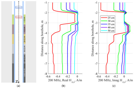 To understand the signals that should be used to extract magnetic properties of a composite medium, it is necessary to analyze the magnetic field itself, as well as the response of the medium under study. We assume that the tool is properly calibrated, i.e., the primary magnetic field has been excluded from the measurements. Figure 3 shows that the real part of the secondary field, , is three orders of magnitude stronger than the imaginary part. Smaller spacings between coils enhance the detection of the magnetic permeability of the cement and the distance between the coils ought to be 25–60 cm (dashed line) to optimize this detection.