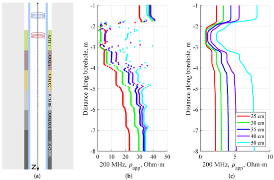 When logging at 200 MHz, see Figure 10 and Figure 11, one can observe a stair-step change of the real and imaginary part of . It is important to note that in this particular case, magnitudes of the imaginary and real parts of were very close and the stair-step changes were opposite for both components. Figure 11 shows that we can easily distinguish a “liquid” cement (1–5 Ohm·m) from a “solidified” cement (50 Ohm·m and more). It is impossible to distinguish a 50 Ohm·m layer from a 100 Ohm·m one, but a trend of solidification can be observed. Short tools are more sensitive to the wellbore and measured the lowest resistivities. Longer tools better sensed the near-wellbore space. Due to the special nature of the electromagnetic field and model complexity, the electrical resistances calculated from the phase, Figure 11b, and amplitude, Figure 11c, differed significantly. For a better display, Figure 11b is plotted as dots because the boundary-related singularities in the resistivity log obtained from the signal phase obscure the tool responses. However, compared with the amplitude, the signal phase was more sensitive to the cement solidification state. The effect of surrounding layers was more significant for the graph generated from amplitude rather than those from the signal phase.