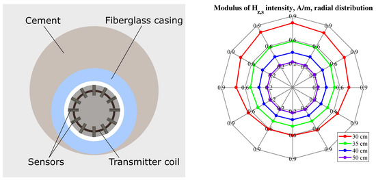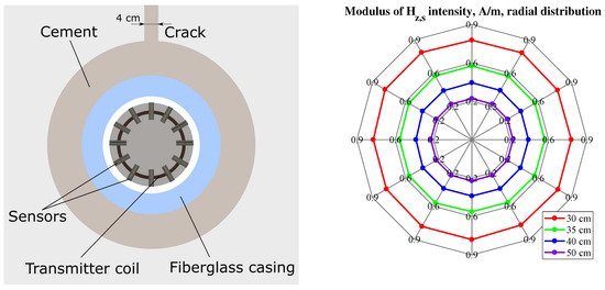 Magnetic logging signals were simulated to study the possible detection of radial inhomogeneities: (1) The eccentricity of the cement, and (2) a crack filled with the magnetic cement. The 3D simulations were performed using the AC/DC module in COMSOL. The model was a 1.5 m long cylinder with a diameter of 1.5 m. The complete mesh consisted of 1,387,193 domain elements, 65,048 boundary elements, and 2327 edge elements. The average element quality was 0.7679. The source of electromagnetic waves was a point dipole with the magnetic moment of 1 A·m, oscillating at the frequency of 1 kHz in the middle of the borehole. The external boundary was assumed to be a magnetic and electric insulator. The distances between the transmitter and receivers were 30, 35, 40, and 50 cm. The influence of the outer boundary was neglected. The magnetic field was registered by 12 sensors evenly distributed inside the casing, see Figure 12 and Figure 13. The geometric and electric parameters are listed in Table 1. The relative magnetic permeability of the cement was 1.5. The tool response was calibrated by subtracting the system response in the air. Figure 12 shows that an asymmetric distribution of magnetic cement can be detected by the proposed tool. Figure 13 shows that a small radial crack filled with cement was invisible to the tool. The distance to the crack was too large and the contribution to the signal from the anomaly was less than the tool’s measurement error. However, insufficient cementation near the casing could be detected with magnetic logging signals.