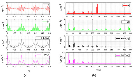 In [32] it was shown that the transformation of a signal including numerous frequency components (f1, f2, f3, …) leads to signal ψ(·) containing components of sums and differences of frequencies f1 ± f2, f1 ± f3, f2 ± f3, … Thus, in the case of faults resulting in amplitude modulation, according to (6) and with consideration for various values of k, m in this dependence, in signal spectrum ψ(·) frequencies fr, 2·fr, fbf, 2·fbf, etc., should be strengthened. For the purpose of illustrating the characteristic features of the above listed signal processing methods, Figure 1 presents the analysis of a sample amplitude modulated signal.