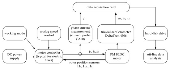 The permanent magnet brushless direct current motor (PM BLDC), due to its advantages (high efficiency, high power factor, very good power to volume ratio, low maintenance requirements), is increasingly used in various industrial drives and a large number of electrically-propelled or electrically supported vehicles. This extensive range of applications is influenced by the values of exploitation parameters, such as multi-fold torque overload capacity, low moment of inertia, increased general efficiency, and a wide range of rotational speed regulation [1,2]. However, despite these considerable advantages, during exploitation, PM BLDC motors are fault-prone due to the occurrence of various damages [3,4,5]: