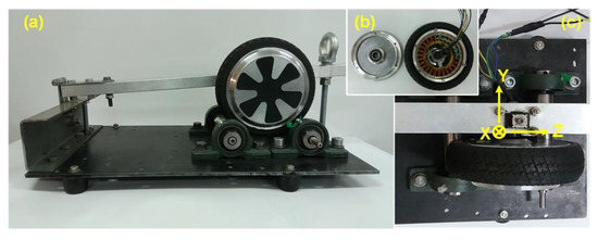 During the tests of the proposed methods a wheel embedded PM BLDC was used. The scheme of the laboratory setup is presented in Figure 2 and its general view in Figure 3. A slow-speed PM BLDC type motor, 350 W, 36 V supply voltage was used in the tests. Its characteristic features encompass a compact size and the fact that a motor axis is brought out at only one side of the casing. For the purpose of enabling drive tests also with a load, the tested motor was located on a pendulating arm which could press the external rubber tread of a rotor to metal rotating rolls. The pressing power was regulated by the appropriate fixing of a nut on the screw holding the pendulating arm. In the article, the elaboration of the discussed issue was limited only to drive operation without load, with a wheel rotating in the air. The reason why was the elimination of factors originating from the remaining mechanical part of the setup.