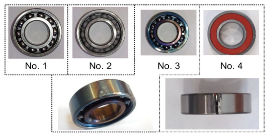 It should also be observed that the defects made were not selective, e.g., sanding encompassed all construction elements of the bearing. Similarly, during welding, the surge current flew from one raceway, through balls to the other raceway. Hence, the way bearings were prepared was different form that frequently presented in the literature (e.g., [34]) where selective faults were made, i.e., only a single bearing element was modified, which usually did not take place during normal operation.