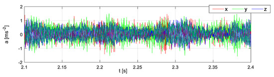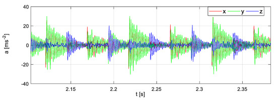 Figure 5 and Figure 6 present vibration acceleration waveforms recorded for an unloaded motor rotating at its maximum rotational speed for two different bearings—a new one (Figure 5) and the one with a cut outer raceway (Figure 6). In the latter case, even the time waveform clearly shows that periodical excitations occurred in the form of decaying vibration with relatively different amplitudes.