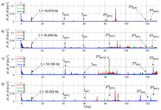 Figure 7 presents the amplitude spectra of vibration acceleration for four different bearings, obtained using the classical FFT analysis. In the cases presented in Figure 7, rotational frequency was similar, and it was about 10 Hz. For the tested bearing (according to dependence 1) it corresponds with basic fault frequencies approximately equal to 26.5 Hz (fBSF), 41 Hz (fBPFO) and 59 Hz (fBPFI). In Figure 7b,c, one can observe an increase in the amplitude for 42 Hz and 84 Hz frequencies (BPFO fault frequencies). In Figure 7d, it can be seen that despite a clear bearing fault (cut outer raceway), the basic amplitudes of fault frequencies did not increase. The results obtained show that the classic FFT analysis has limited capabilities in detecting bearing failures in the drive under consideration, even in the case of selective failures (Figure 7d).