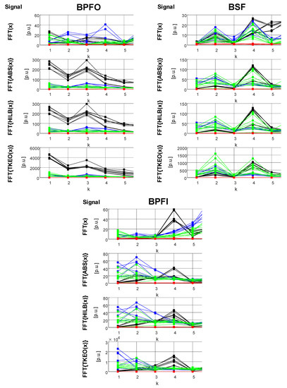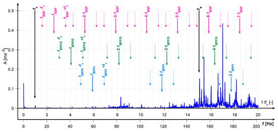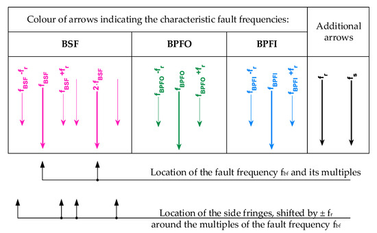 In particular, pink arrows refer to the fault frequencies of the rolling element, dark green—outer raceway, blue—inner raceway. The arrows differ in length and thickness. The more evident ones (longer and thicker) refer to fault frequencies and their multiplicities, while the shorter ones—rotational frequency modulated components. Moreover, in Figure 8, black arrows mark the position of the basic harmonic (fs) of the current supply to the motor and rotational frequency (fr).