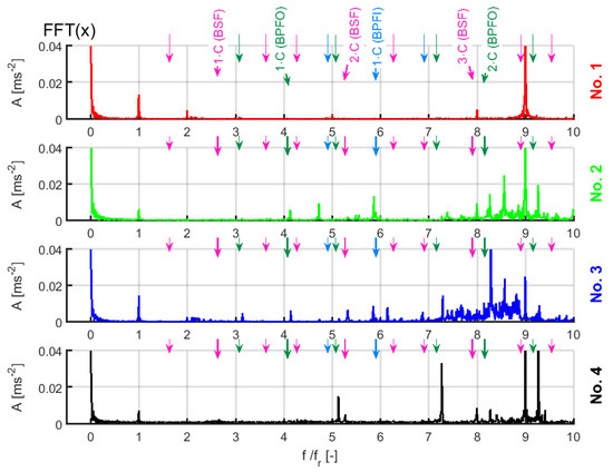 Amplitude spectrum of vibration acceleration for axis X–FFT method, bearing No. 1–No. 4.