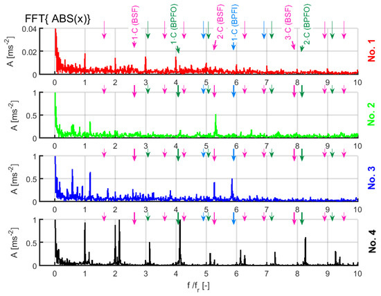 Amplitude spectrum of vibration acceleration for axis X—FFT{ABS(x)} method, bearings No. 1–No. 4.