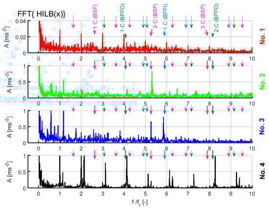 Amplitude spectrum of vibration acceleration for axis X—FFT{HILB(x)} method, bearings No. 1–No. 4.