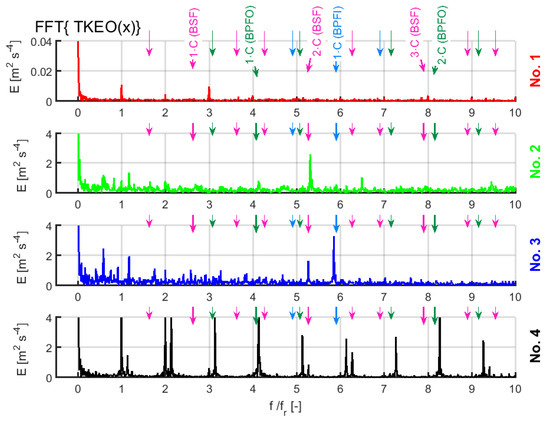 Amplitude spectrum of vibration acceleration for axis X—FFT{TKEO(x)} method, bearings No. 1–No. 4.