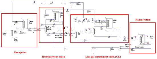 The novel acid gas removal process was simulated by Aspen HYSYS. The simulation flowsheet is shown in Figure 2.