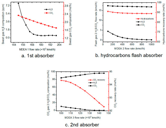 The MDEA flow rate is a key factor for the three absorbers to absorb acid gas. The purpose of the analysis is to optimize the MDEA flow rate, to make the 1st absorber sweet gas reach the standard and hydrocarbon flash absorber, 2nd absorber, absorb more acid gas. The effect of MEDA flow rate on the final sweet gas H2S and CO2 composition was studied, and results were shown in Figure 3a.