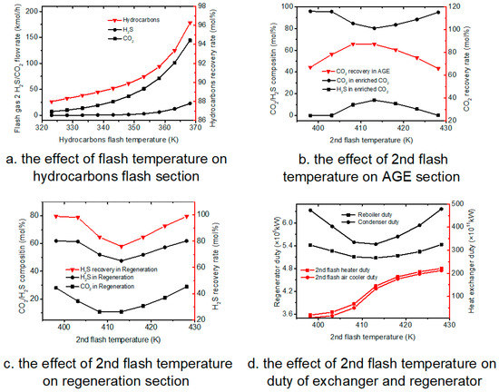 In the hydrocarbons flash section, MDEA flow rate is set as 730 kmol·h−1, and the hydrocarbons flash pressure is set as 500 kPa. The hydrocarbons flash temperature is varied from 323.15 to 368.15 K. Figure 4a shows that, as the operation temperature increases, the flow rate of H2S and CO2 are both increases, while increasing T is more effective in promoting CO2 flow rate than H2S flow rate. On the other hand, increasing temperature also increased the hydrocarbon recovery rate. A possible explanation can be that at higher temperature conditions, the hydrocarbon solubility in the liquid absorber decreases, thus resulting in a higher hydrocarbon recovery rate.